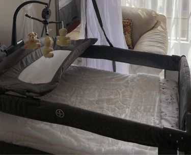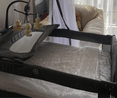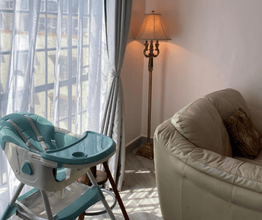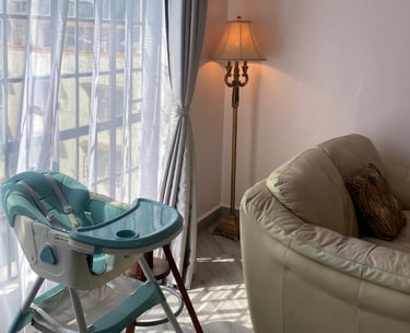 The second bedroom has a double sized bed. It's a cozy, well-lit space perfect for solo travelers, kids, or extra guests. It has a baby travel crib (when needed), a plush sofa seat, ample wardrobe space, and large windows that fill the room with natural light and a refreshing breeze.